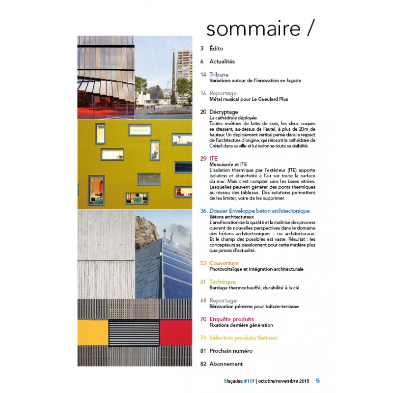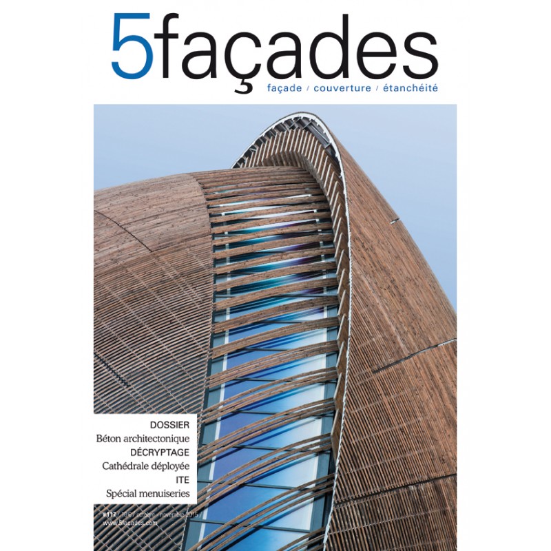 En novembre et décembre, Mondial du bâtiment et, dans une moindre mesure, COP21 : le secteur du bâtiment et de la construction sera sous les feux de l'actualité. Batimat, c'est, bien sûr, l'occasion de faire son marché en nouveaux produits et systèmes. Les industriels de l'enveloppe, souvent à la point de l'innovation, séduiront par une offre renouvelée, apte à répondre à l'ensemble des contraintes d'une construction ou rénovation moderne : confort d'été et d'hiver, apport de lumière naturelle, esthétique. Car s'il est important de bien isoler l'enveloppe, il est tout aussi important que celle-ci flatte la vue... Le confort visuel trop souvent oublié - merci les entrées de ville -, autant que le bruit, mine notre moral. Ce numéro de 5façades, nous l'espérons, apporte la preuve qu'une enveloppe bien travaillée, intégrée à son environnement avec originalité, est bonne pour notre moral. Qu'il s'agisse du bois avec la cathédrale de Créteil, de l'acier et de l'inox avec Le Gueulard Plus à Nilvange (57), ou de la matière brute avec le béton au Havre, prenez-en plein la vue.