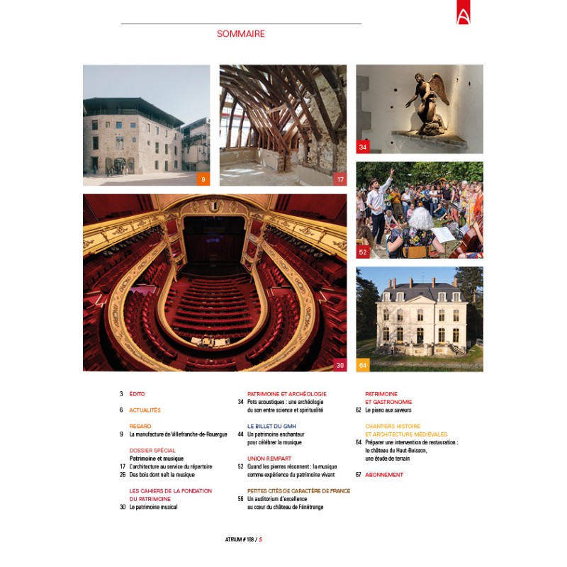 Notre patrimoine bâti compte nombre d'œuvres dédiées à la musique, car depuis la nuit des temps, l'Homme aime écouter, jouer et chanter pour nourrir ses émotions. Ces ouvrages sont souvent complexes et délicats car, en musique comme en architecture, l'harmonie reste un fragile équilibre.